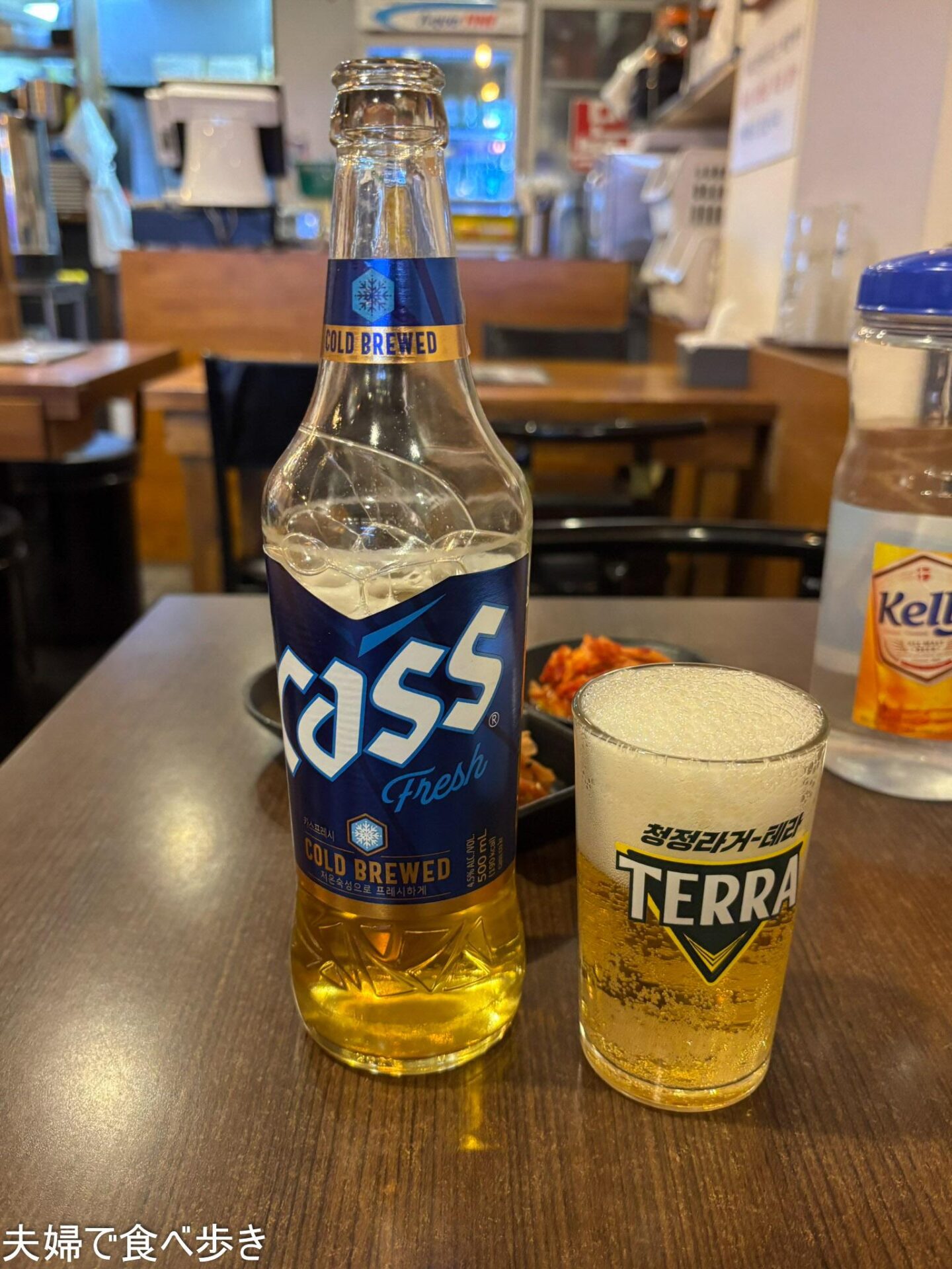 鼻から出る息も白くなる。確認したら-2℃だった。そら寒いわ。スープが欲しいと思って、スンドゥブチゲとチヂミをかねてから食べたいと思ったので海鮮ニラチヂミを注文してみた。そしてビールをもらう。