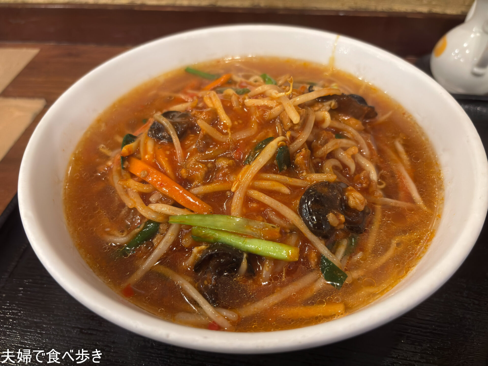 醤油ラーメンにあんかけがかけられたラーメン、あんかけがスープに混ざらないうちは、甘めのスープの醤油ラーメンといった感じ。あんかけだけを食べ始めたが、そこまで辛さは感じないと思った。ところが、辛さが蓄積していく。特に喉に蓄積するので、むせないように注意しながら食べるといいだろう。
