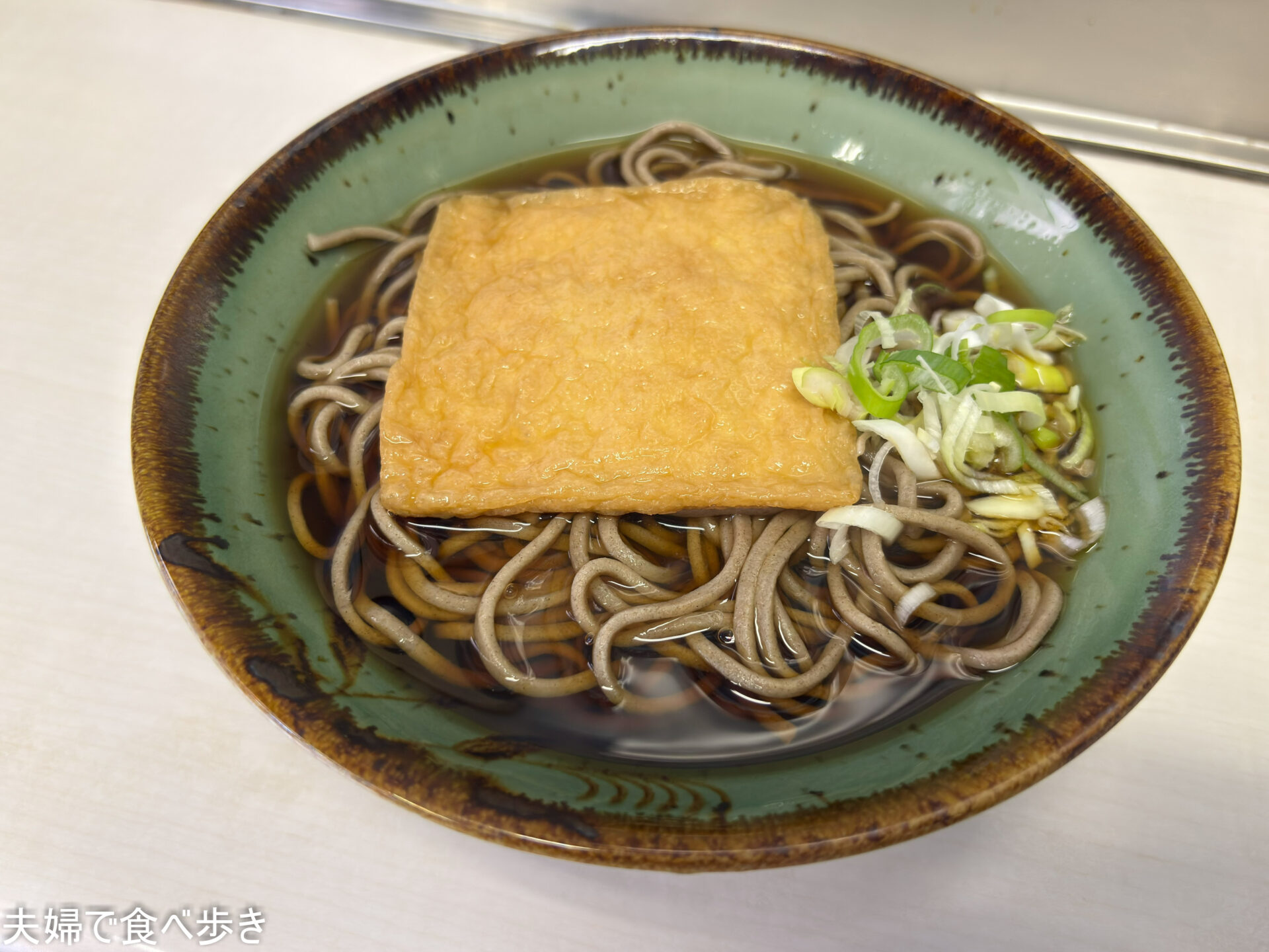 四角いお揚げに黒いつゆ、ネギがちょこんと乗せられている。