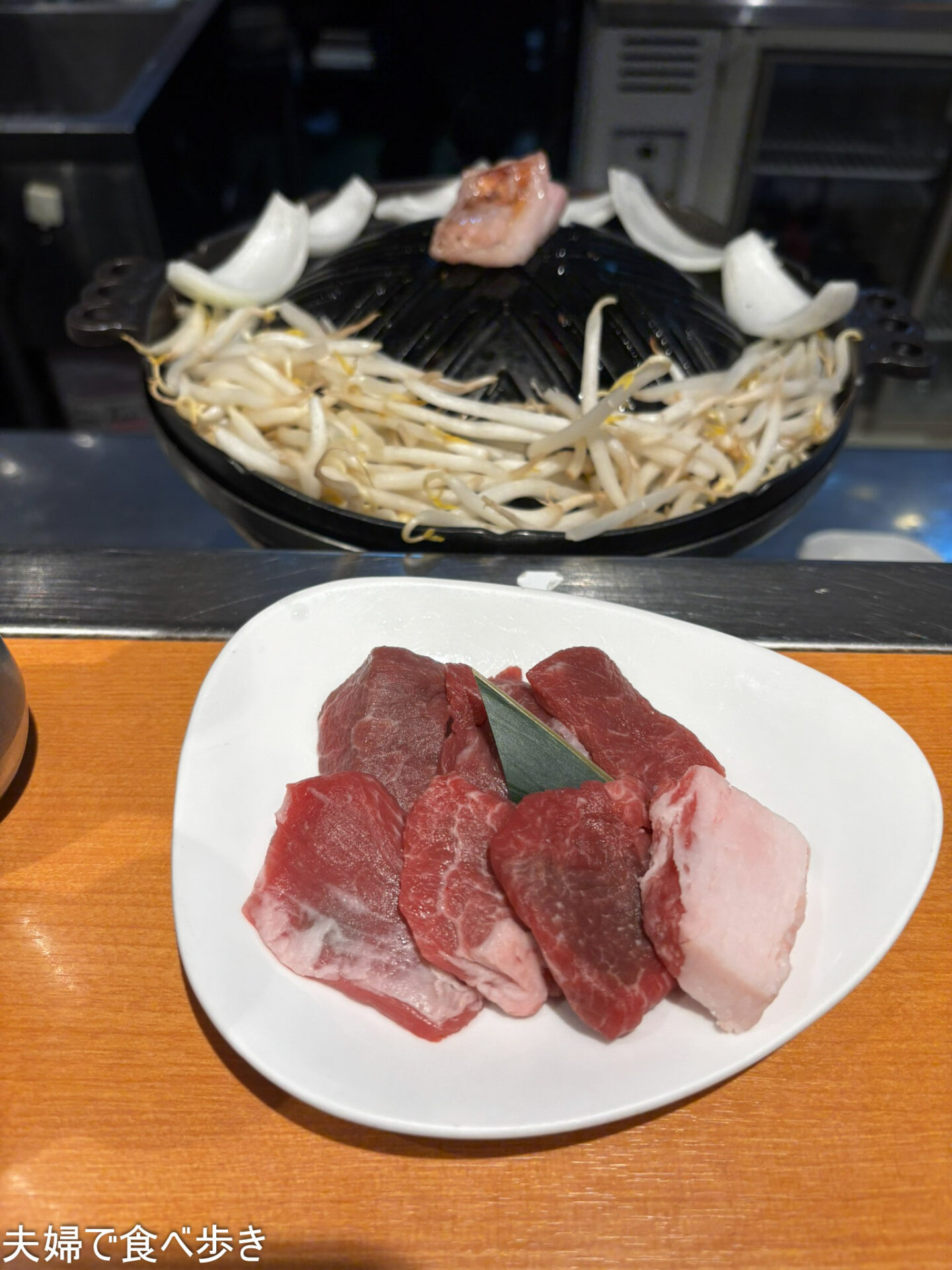 当店一押しのジンギスカンセットを注文する。サフォーク種、ホゲットの食べ比べ。鍋を用意してくれて、野菜を並べる。鍋のてっぺんに脂を置いて、よく焼きこむ。